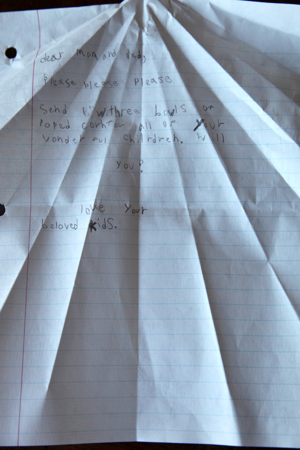 When they are REALLY supposed to be in bed and have been threatened if they get out of bed we will get notes or paper airplanes thrown down to us with random pleas.