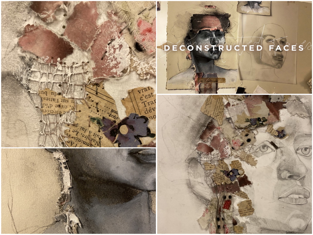 Kate will show you how to render the pencil drawing using the cross hatching technique. You will be supplied with a line drawing of this face which makes this technique applicable to all levels. The other face will be painted in gray values. Image transfers will be created and torn to add to the face creating a deconstructed, layered piece of art. Kate shows you several embroidery techniques to bring the transfer pieces together.