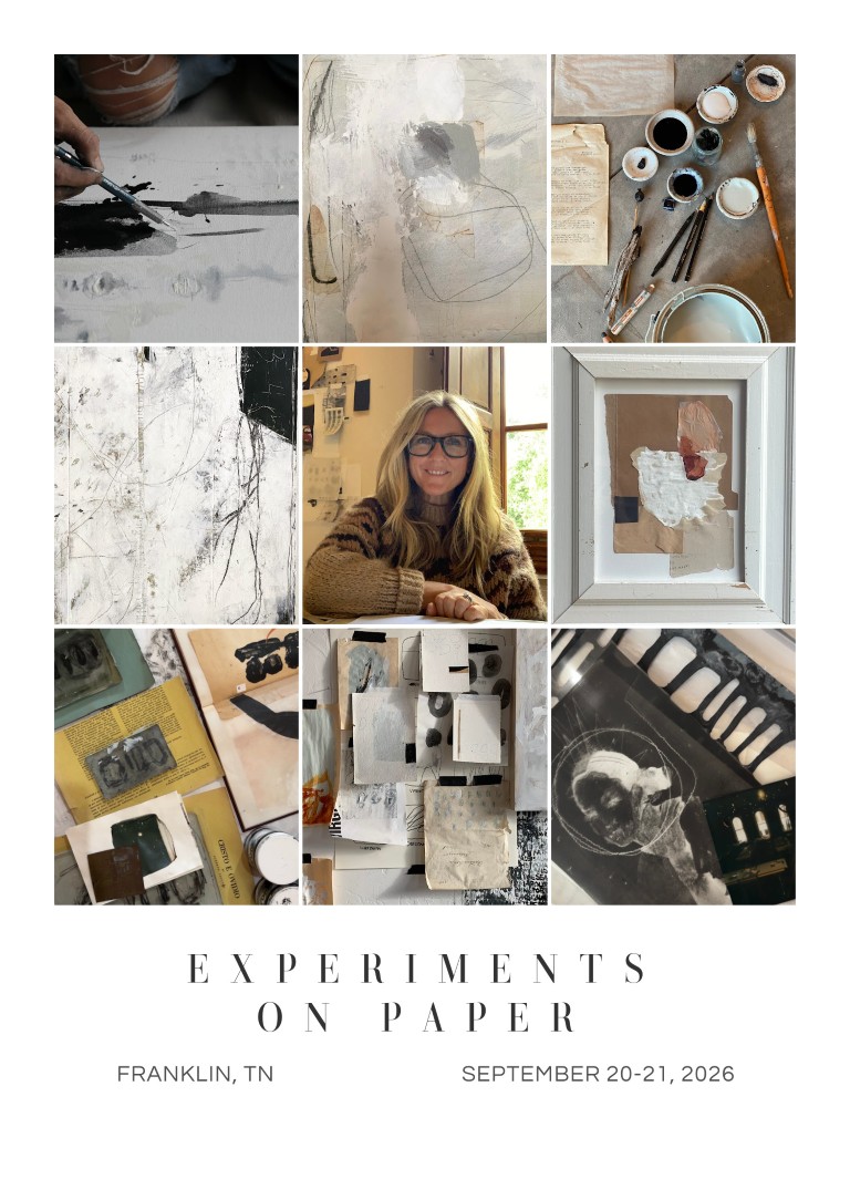 Join me this fall in beautiful Franklin, TN for a two day workshop in the upper loft of DeAnn Gallery. Old wooden floors, worn brick and quaint window views will be our studio. The focus will be Experiments on Paper! We will begin with a stitched journal and then move into printmaking. We will explore tetra pak printing, mono printing, polaroid emulsion lift, cyanotype printing and more. We will then take all of our prints on paper, along with vintage papers, and create collages with them. We will even take one of our mono prints and create a poster out of it.