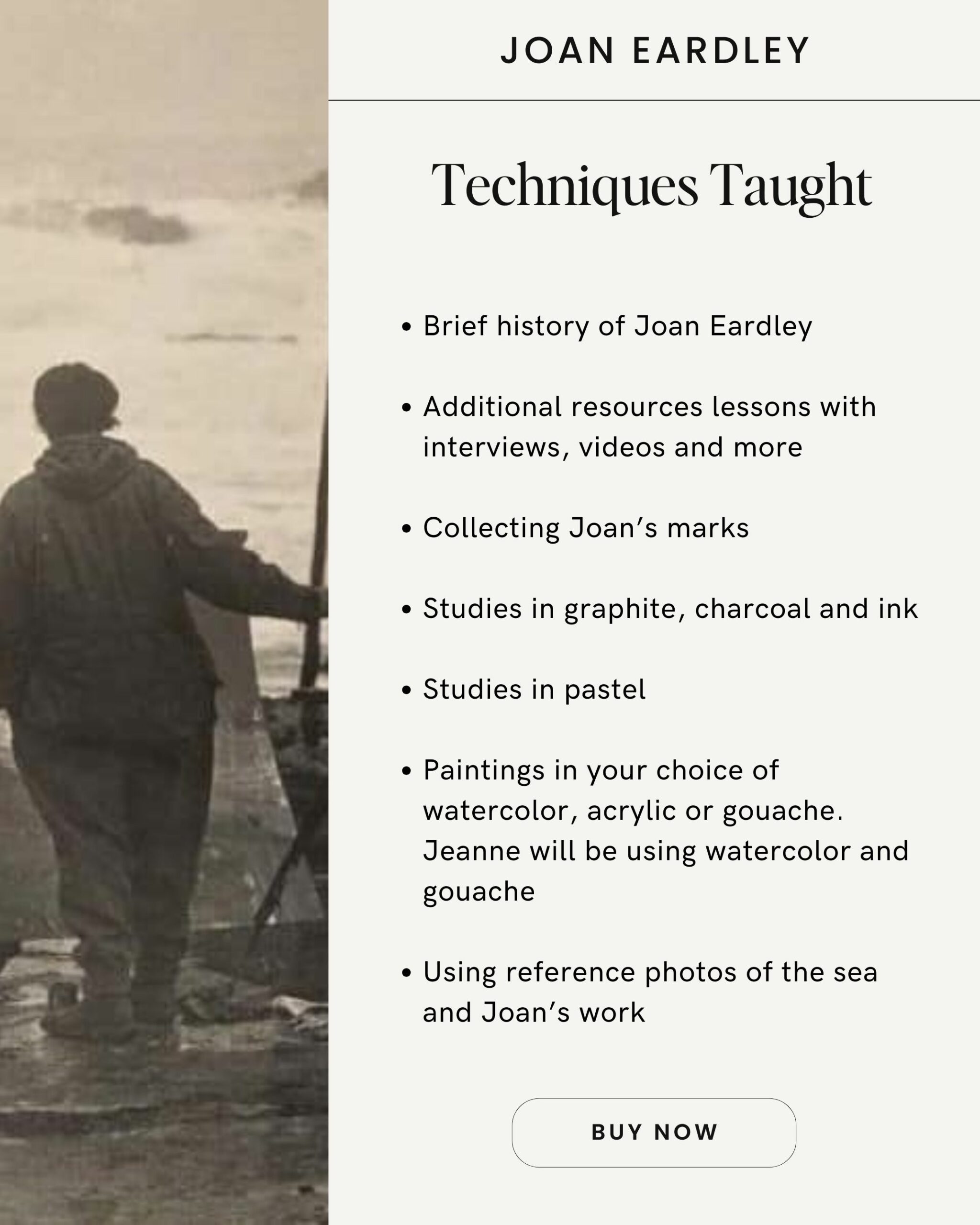 We will begin with a brief history of Joan and her work and then study her marks. We will do multiple studies in graphite and charcoal followed by works in pastel. Part two of the workshop will focus on creating expressive paintings of the sea based upon our previous work. We will be guided the whole time by the work of Joan.