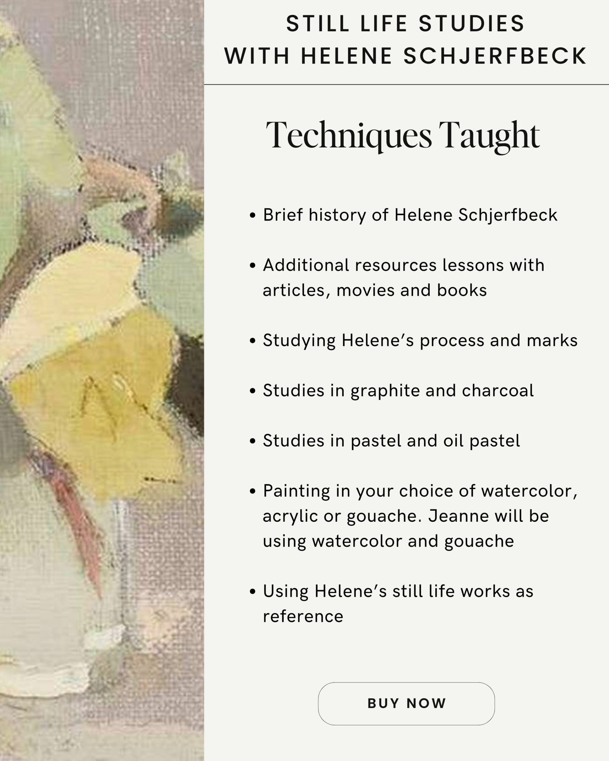 Join me for a two part live Zoom art workshop where we will study the still life work of Helene Schjerfbeck. We will begin with a brief history of Helene and her work and then study her marks. We will do multiple studies in graphite and charcoal followed by works in pastel and oil pastels. Part two of the workshop will focus on creating gouache painting (feel free to use acrylics or watercolors too) of one of the still life references.