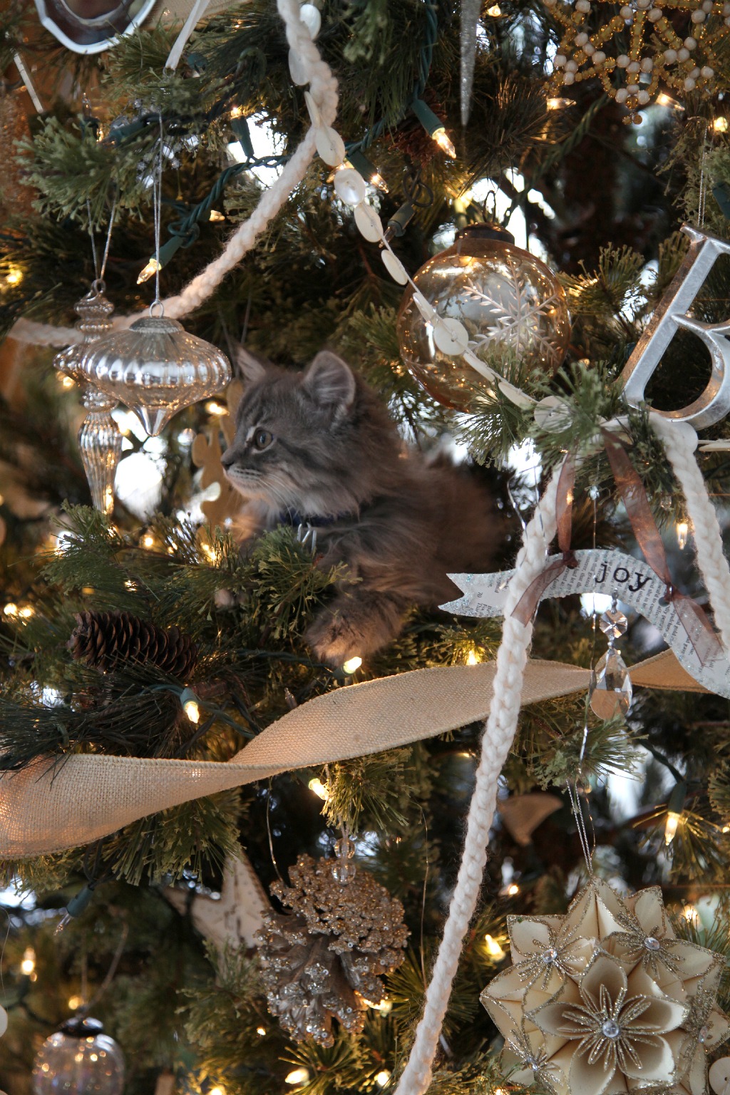 Your Christmas home is so lovely. I feel so warm and cozy looking at the photos. And the kitten is so cute sitting in the tree. Naughty kitty. 🙂