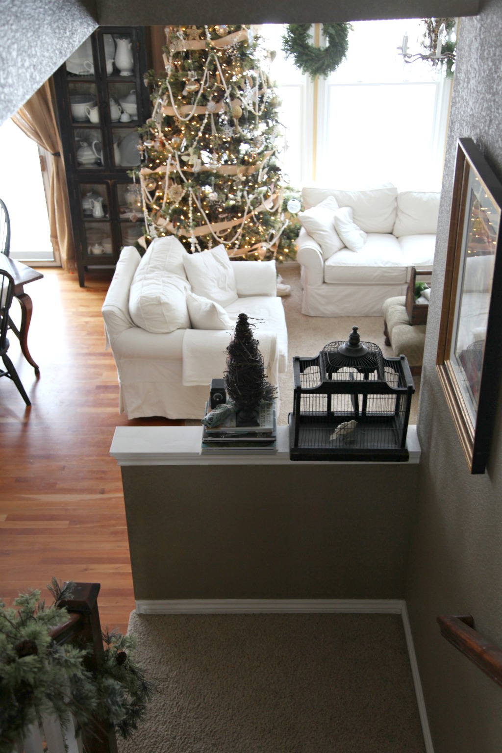 Jeanne- everything looks absolutely gorgeous! I love the tree in the tub by your front door, the garland on your tree, and the window nook at the top of your stairs. Every detail!! 😉